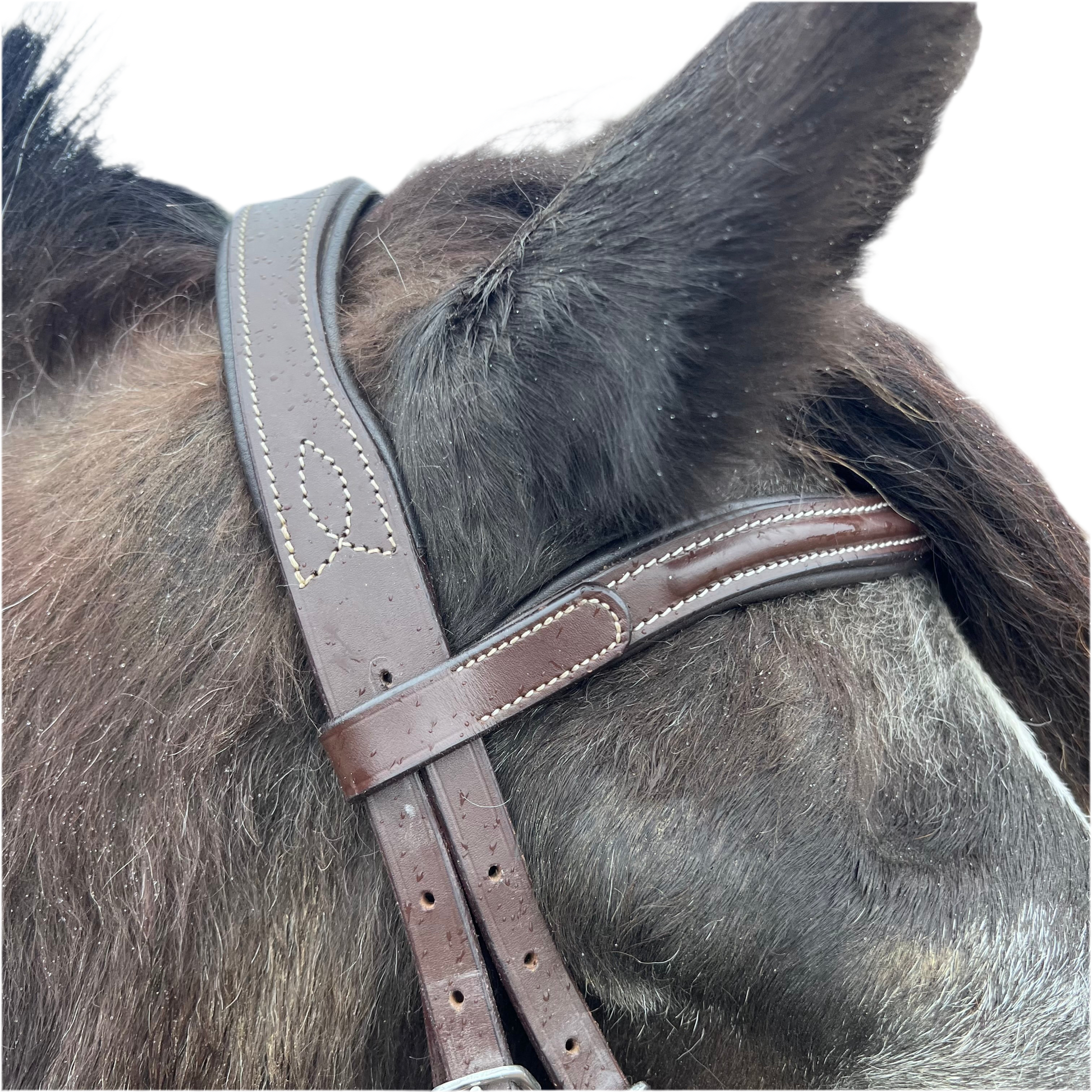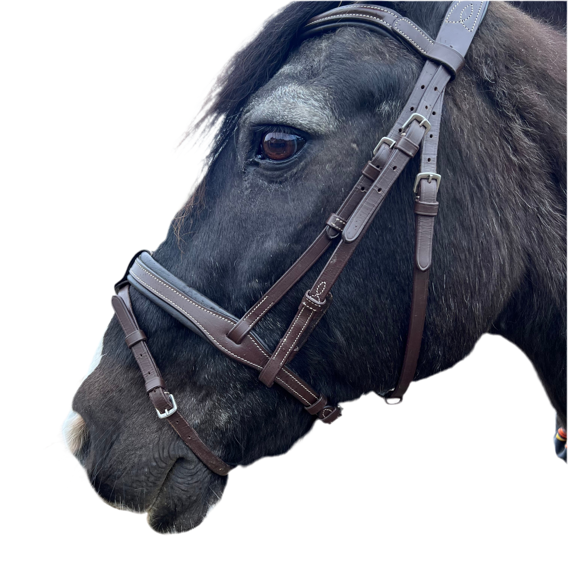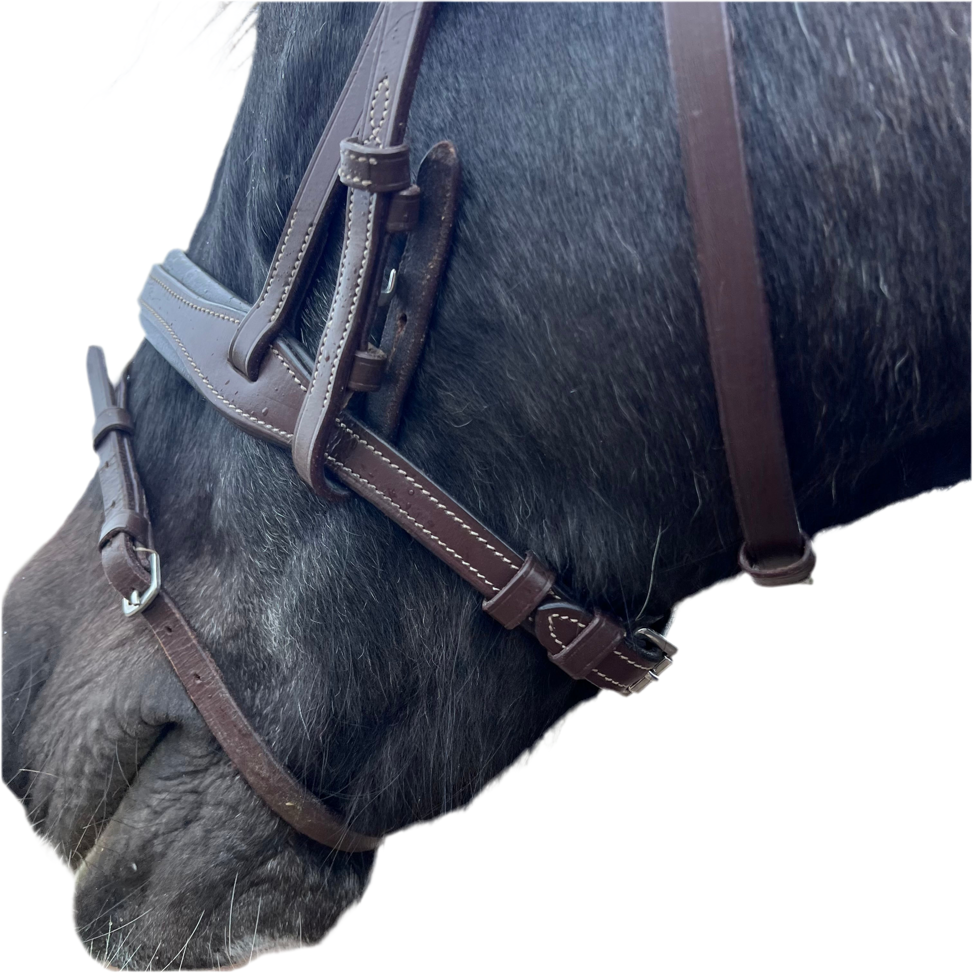 Bride poney en cuir véritable, conçue spécifiquement pour l'anatomie des poneys. Offre un contrôle précis et une communication optimale entre le cavalier et sa monture. Fabriquée avec des matériaux durables et ajustables pour un confort maximal et une longévité accrue, même lors d'utilisations intensives.