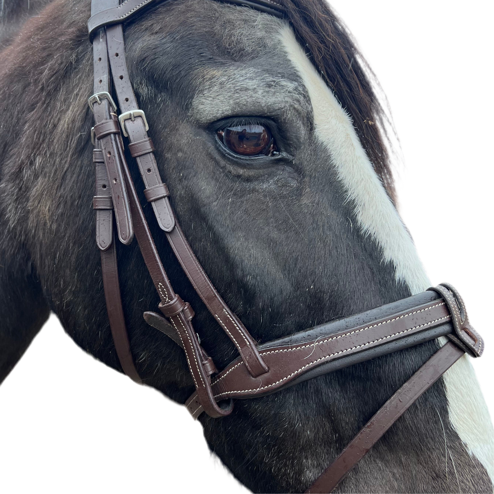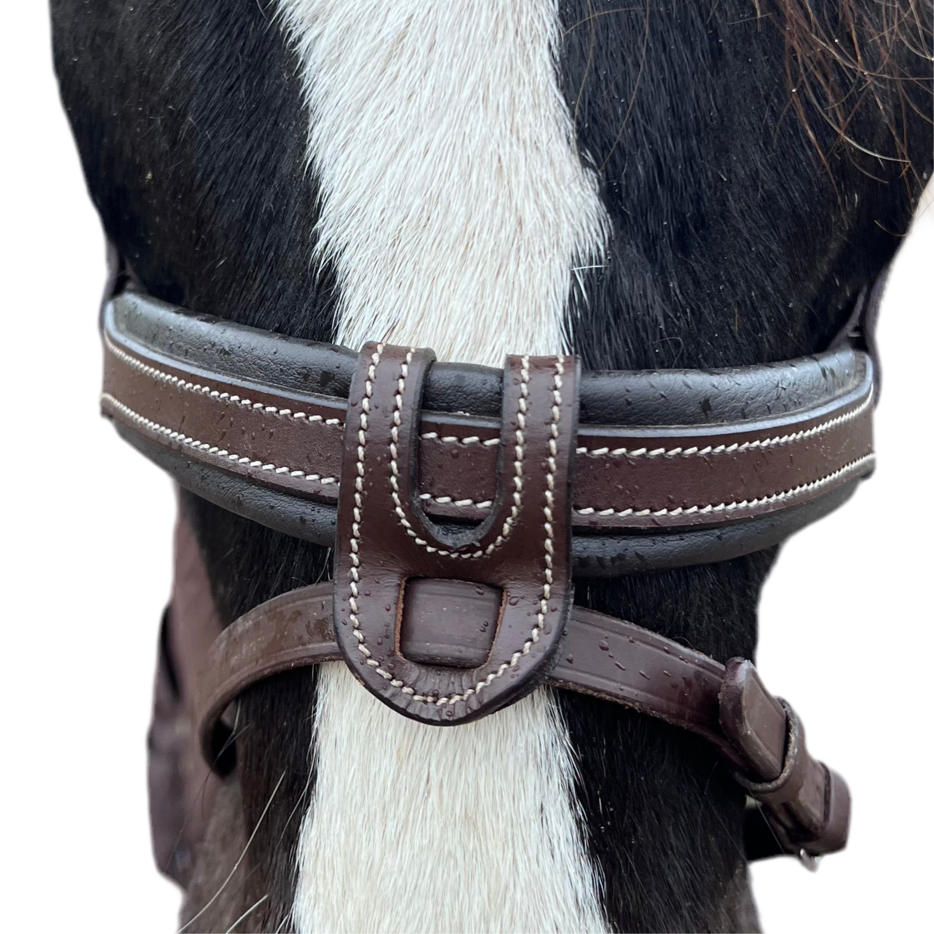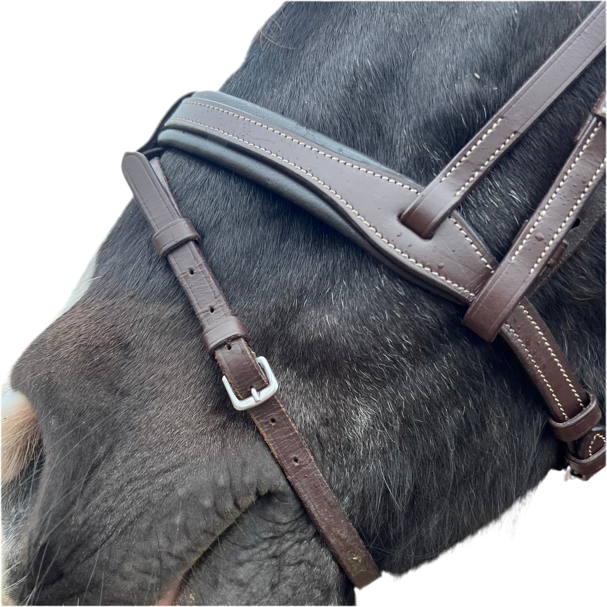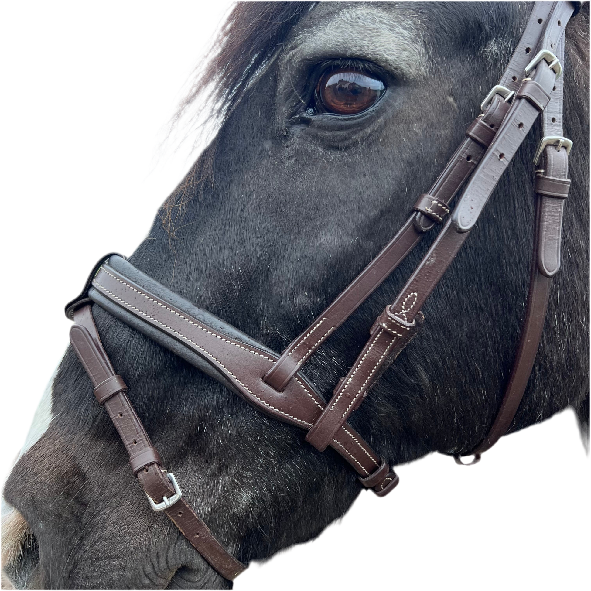 Bride poney en cuir véritable, conçue spécifiquement pour l'anatomie des poneys. Offre un contrôle précis et une communication optimale entre le cavalier et sa monture. Fabriquée avec des matériaux durables et ajustables pour un confort maximal et une longévité accrue, même lors d'utilisations intensives.
