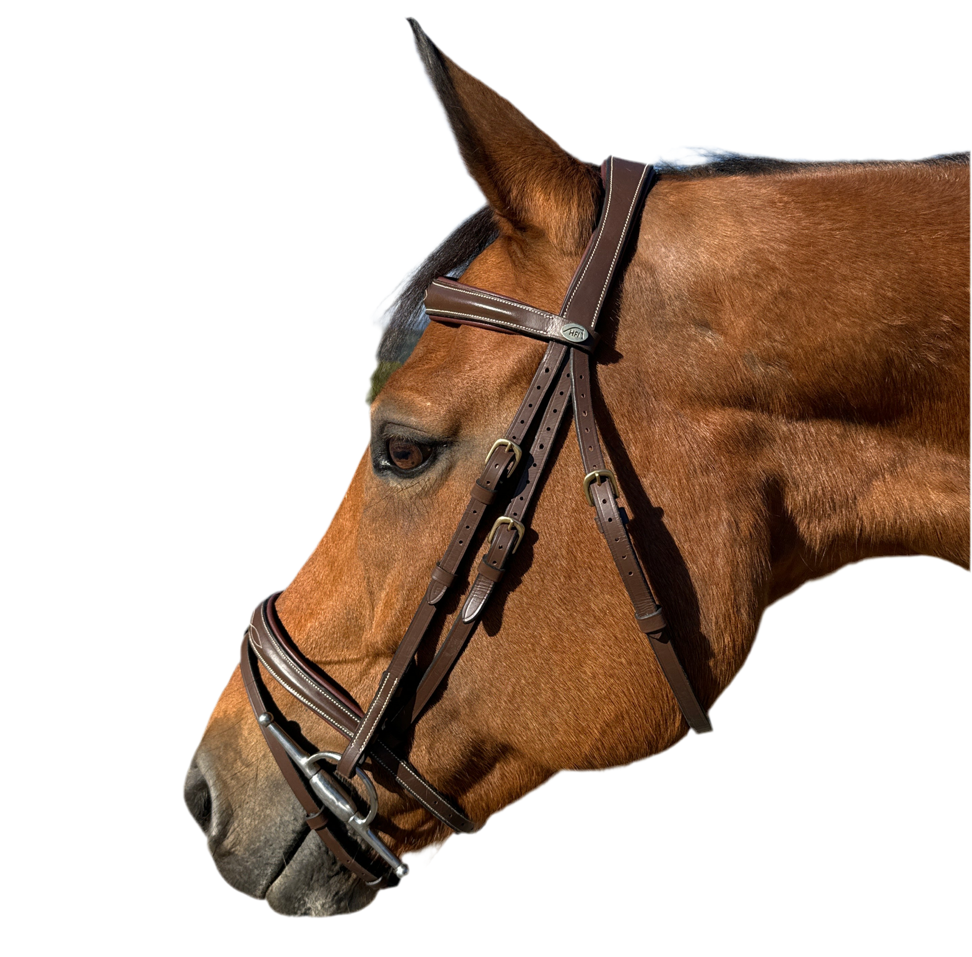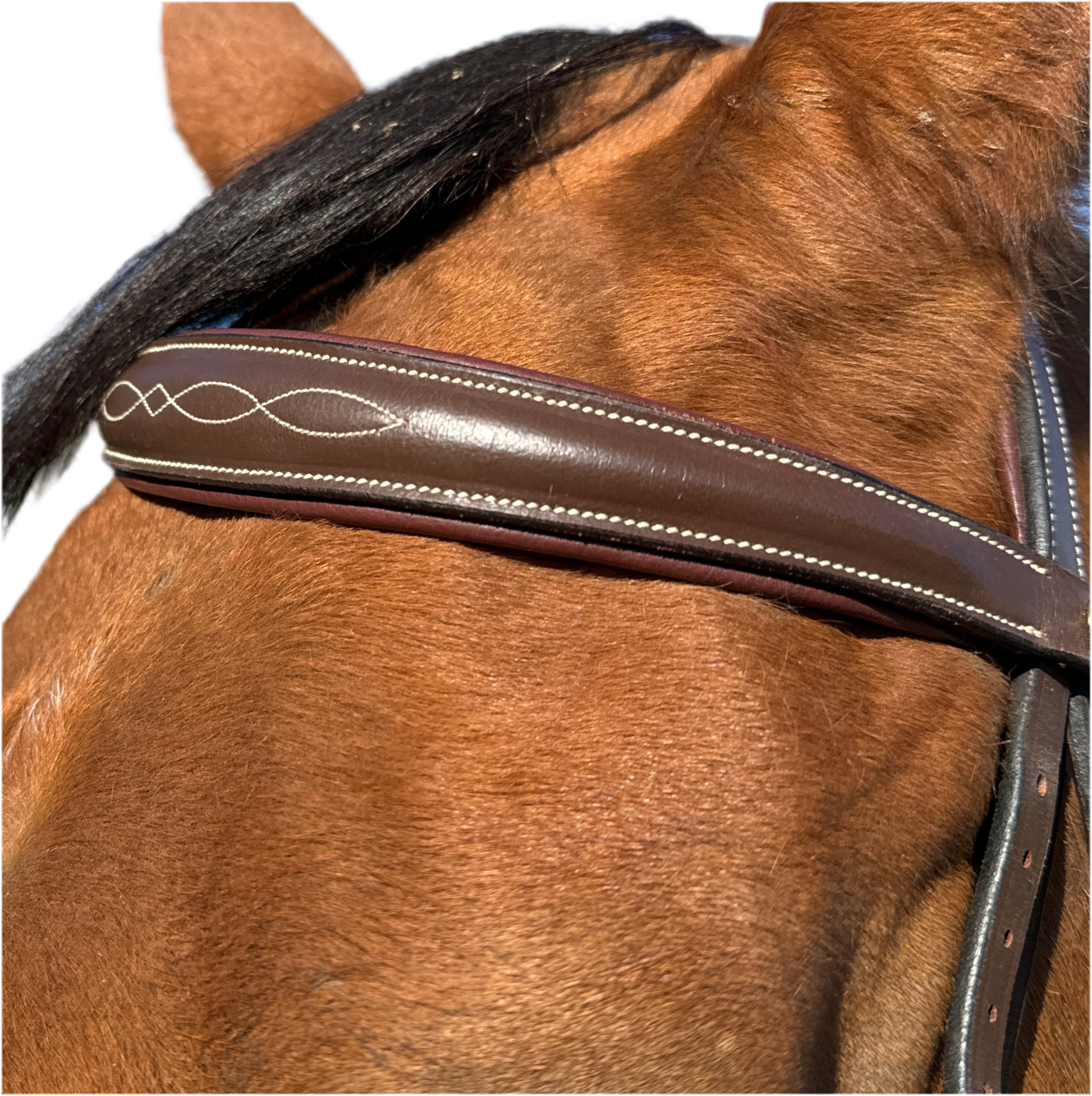 Ce bridon possède une têtière anatomique, un frontal et une muserolle rembourrés et doublés de cuir souple avec des surpiqûre décoratives.