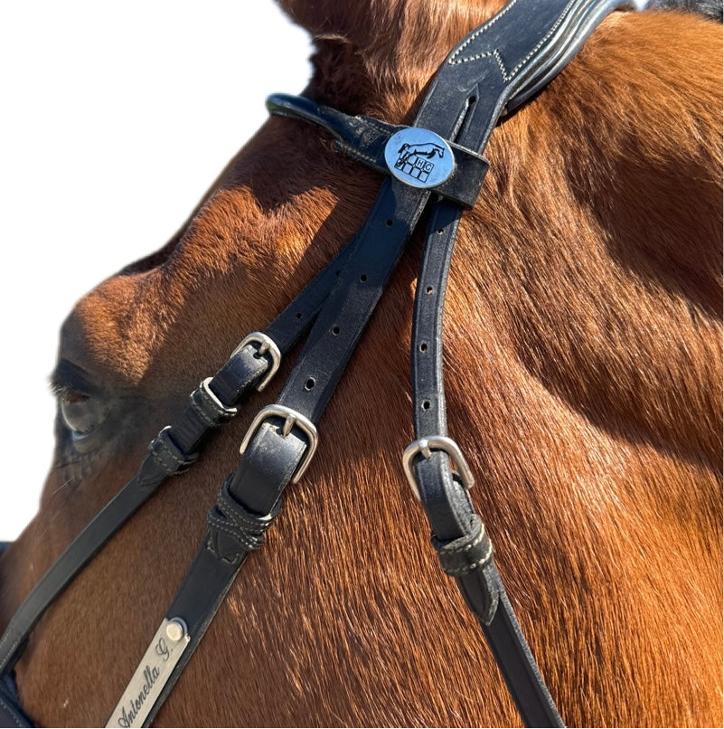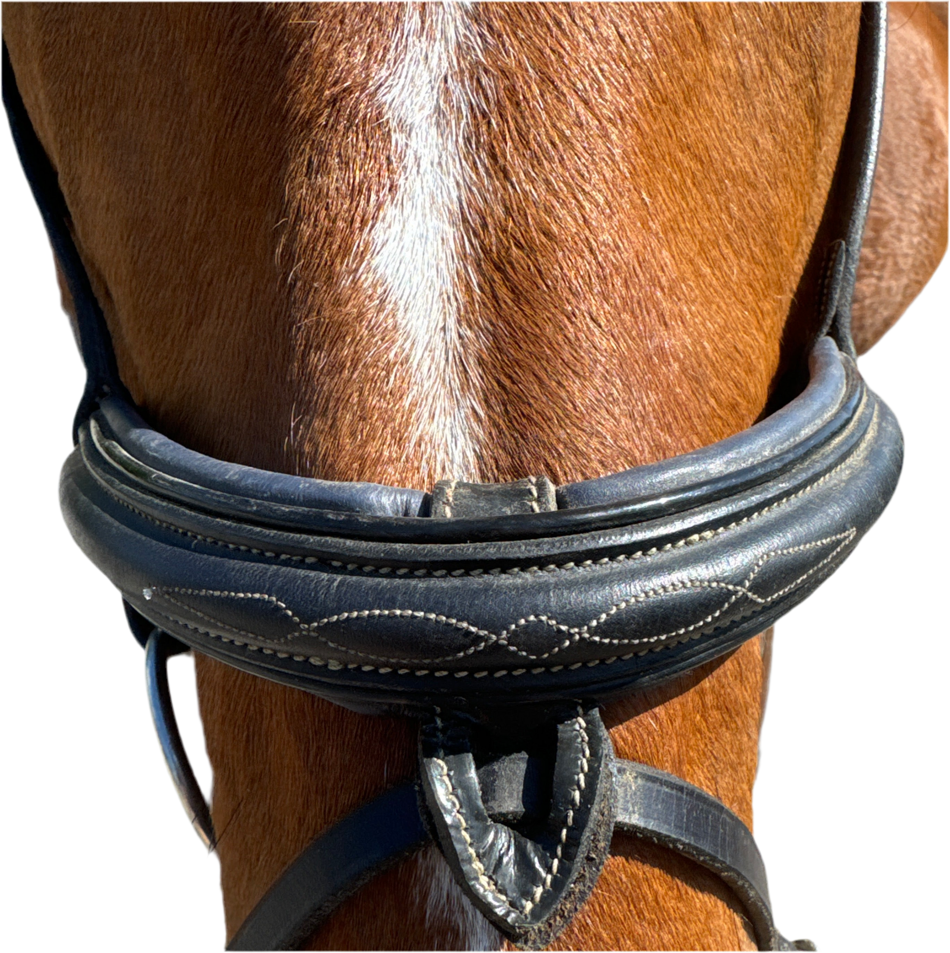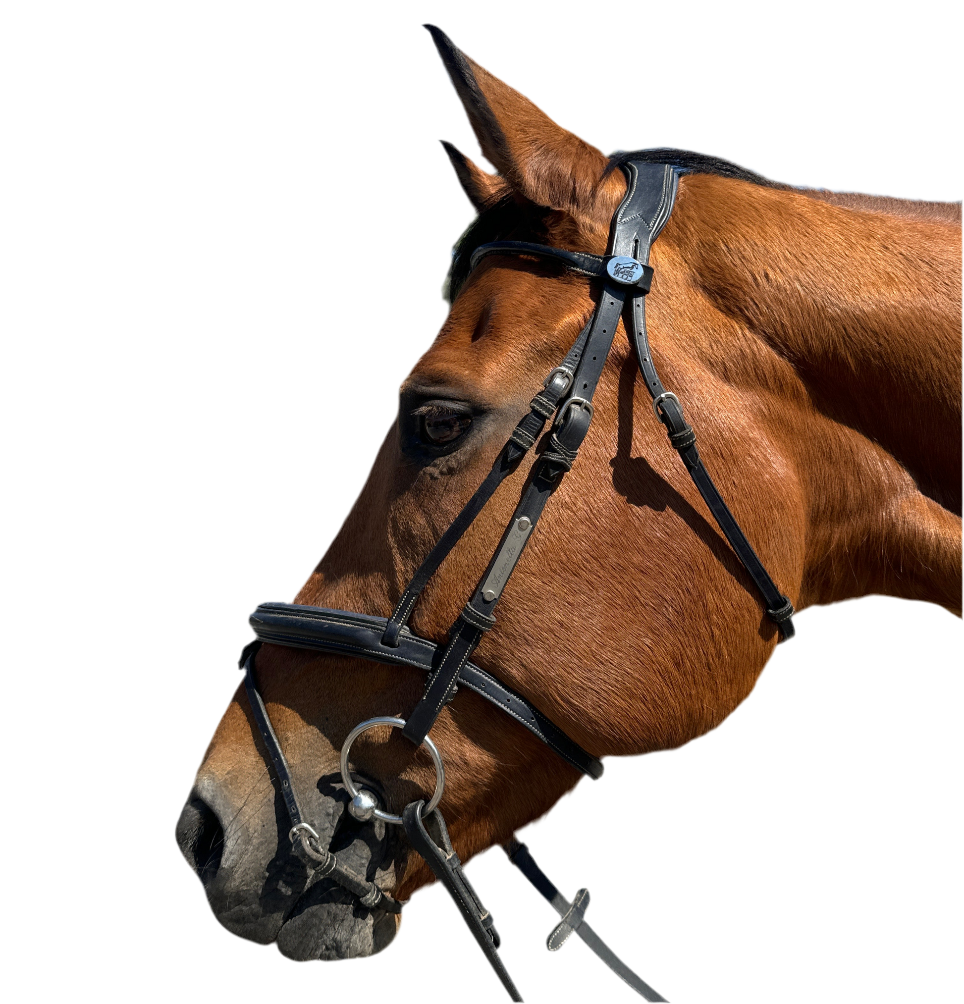Ce bridon possède un frontal rond ainsi que des surpiqûres sur la muserolle. La têtière se positionne parfaitement ce qui évite les risques de pressions. Vendu avec mors simple double brisure jumping.