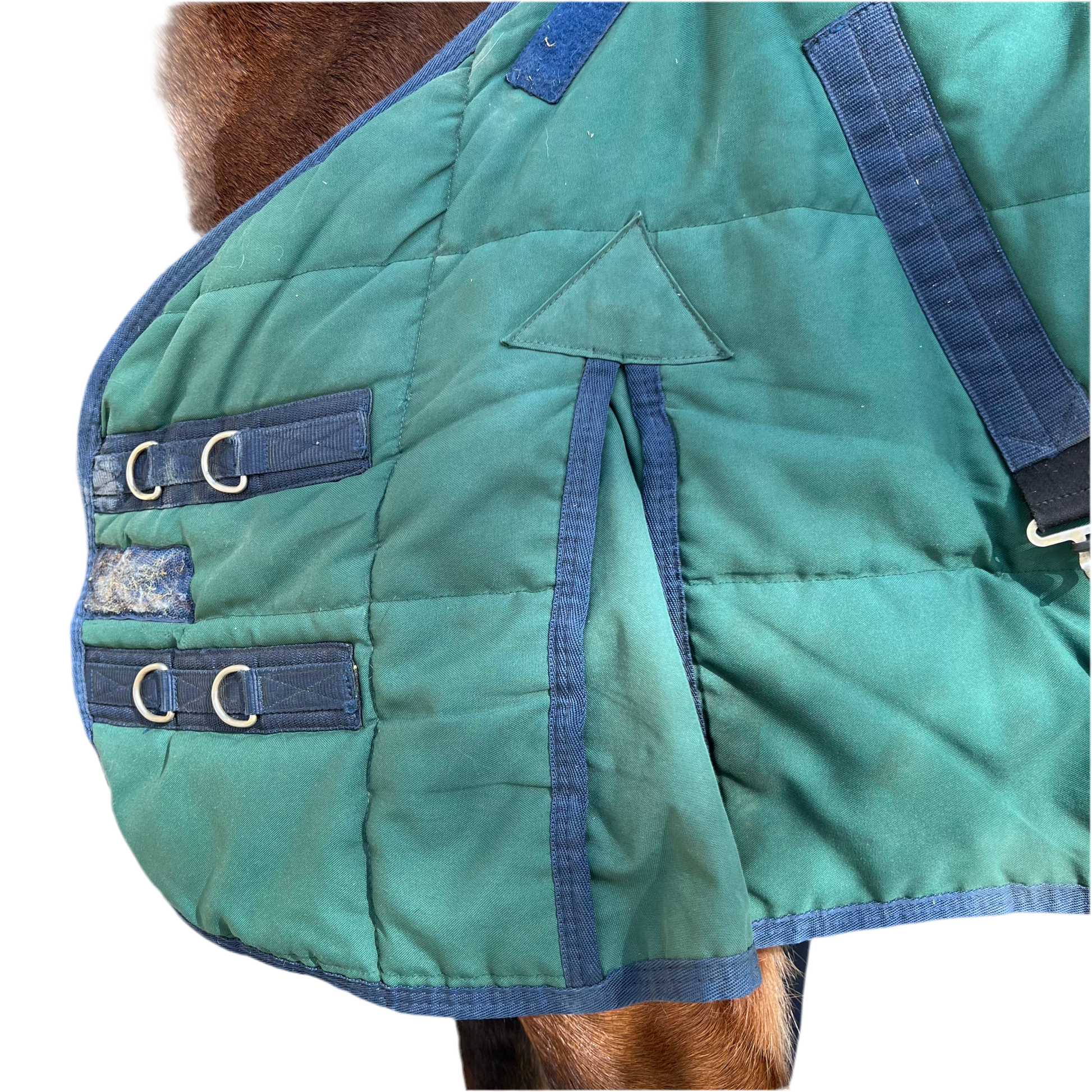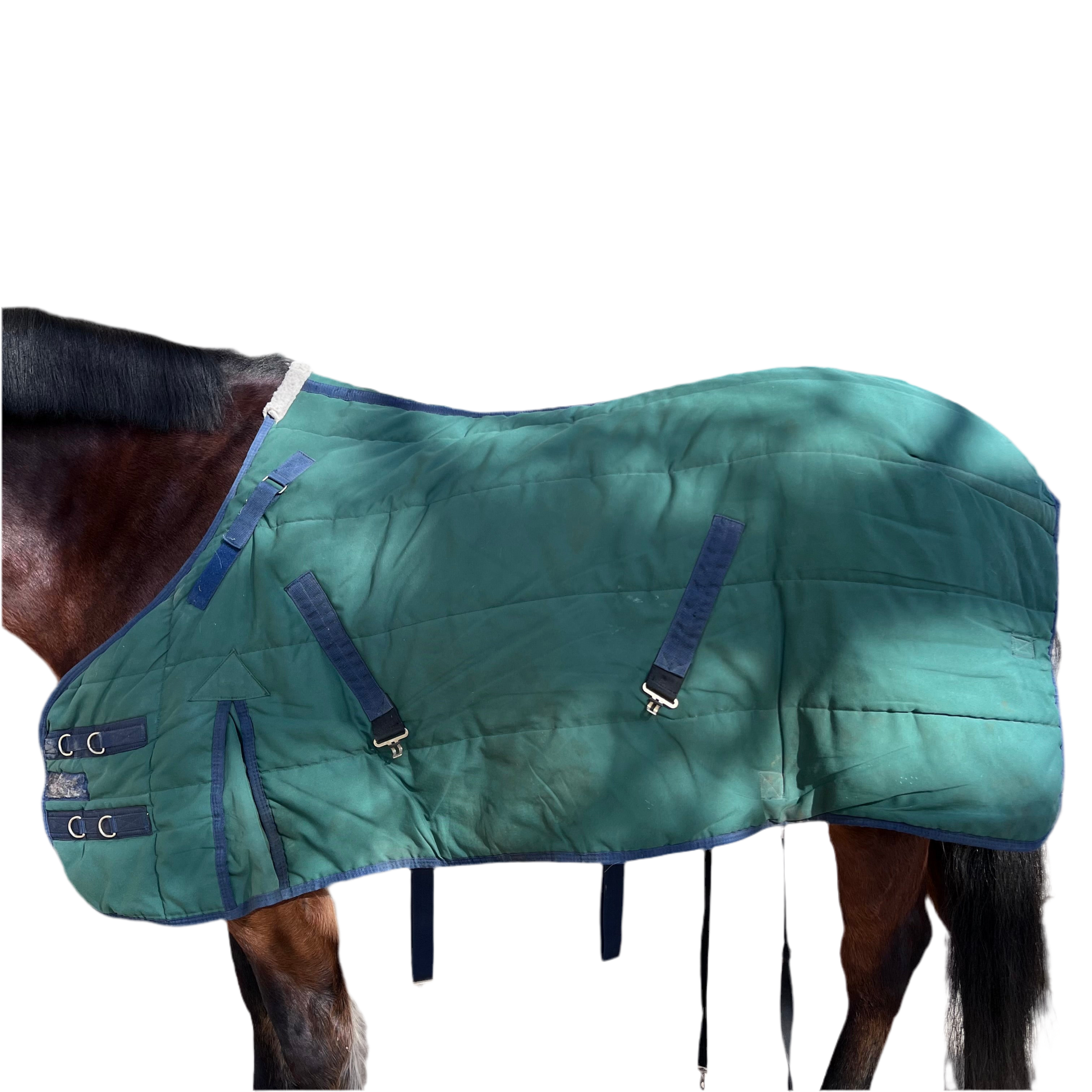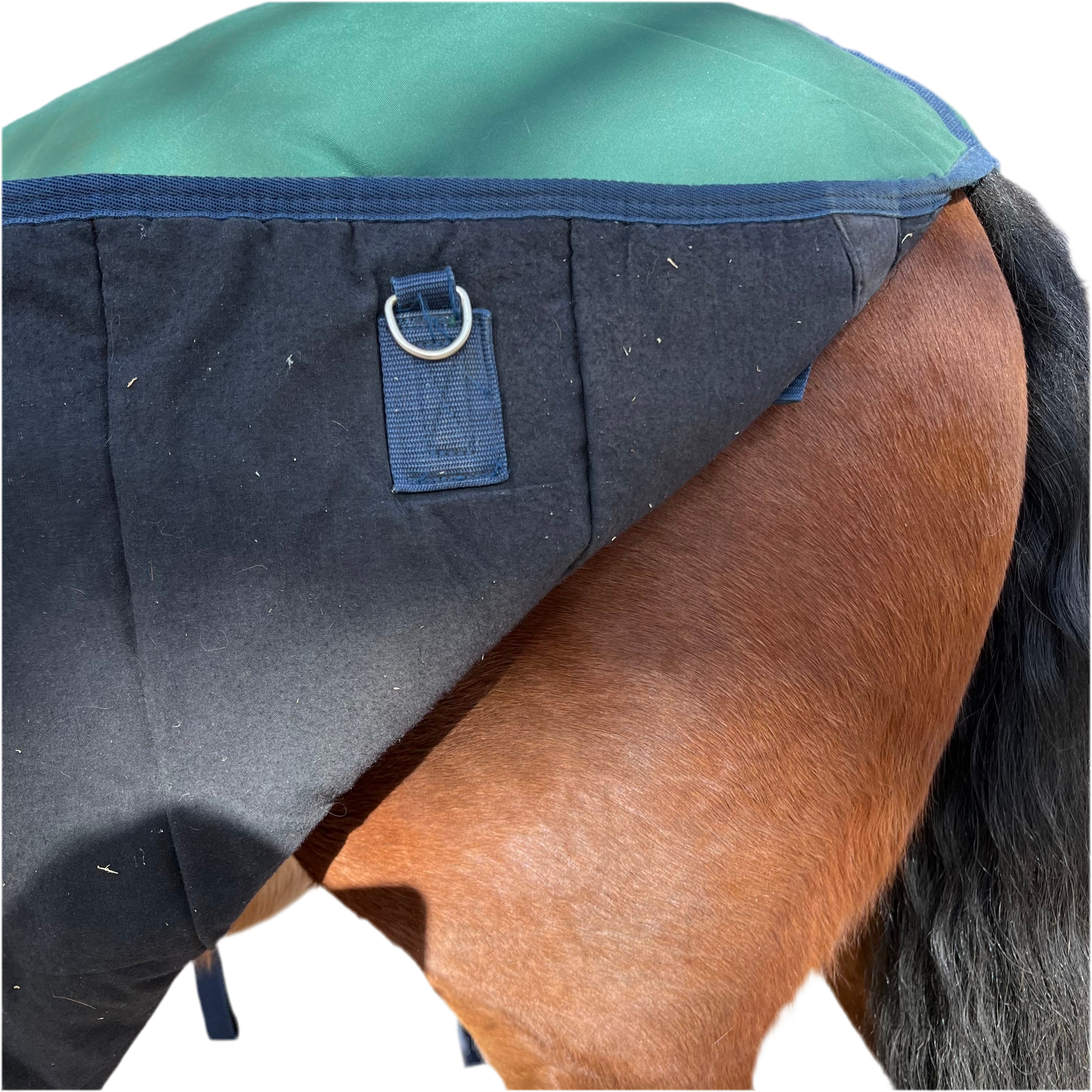 Cette couverture de box possède un grammage entre 300 et 400g, ce qui lui permet de maintenir le cheval au chaud même dans la journée les plus froides d’hiver.