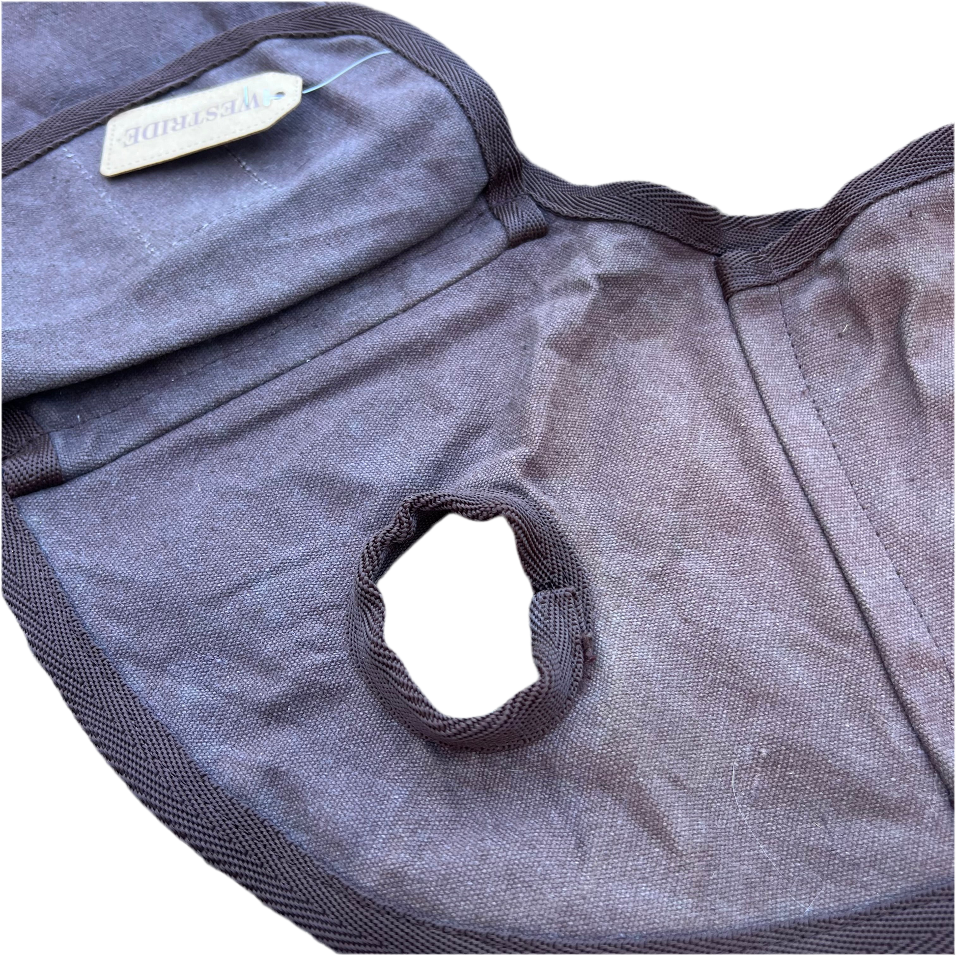 Cette sacoche possède au centre un trou pour accrocher au pommeau de la selle.