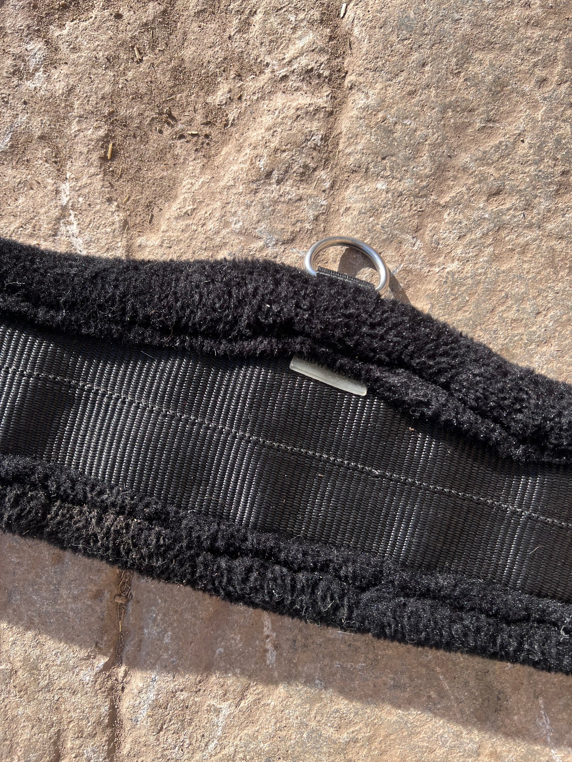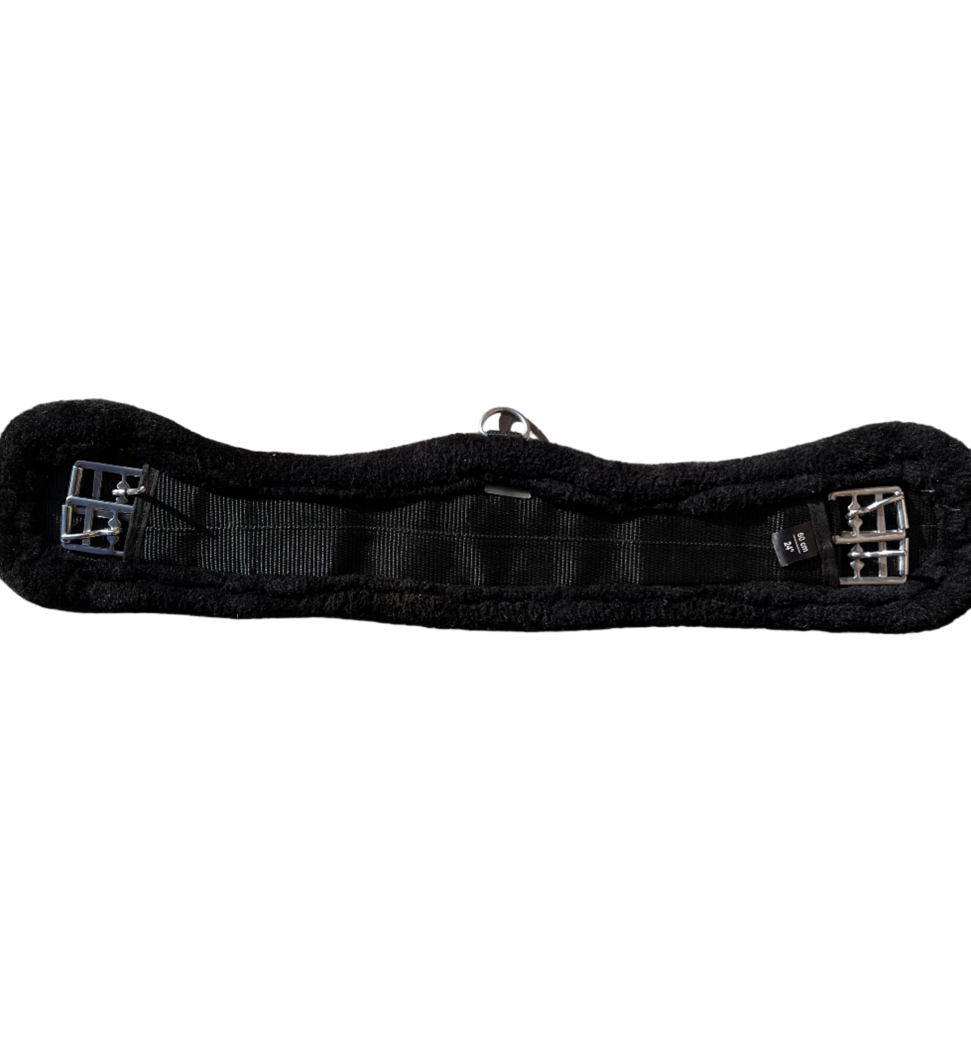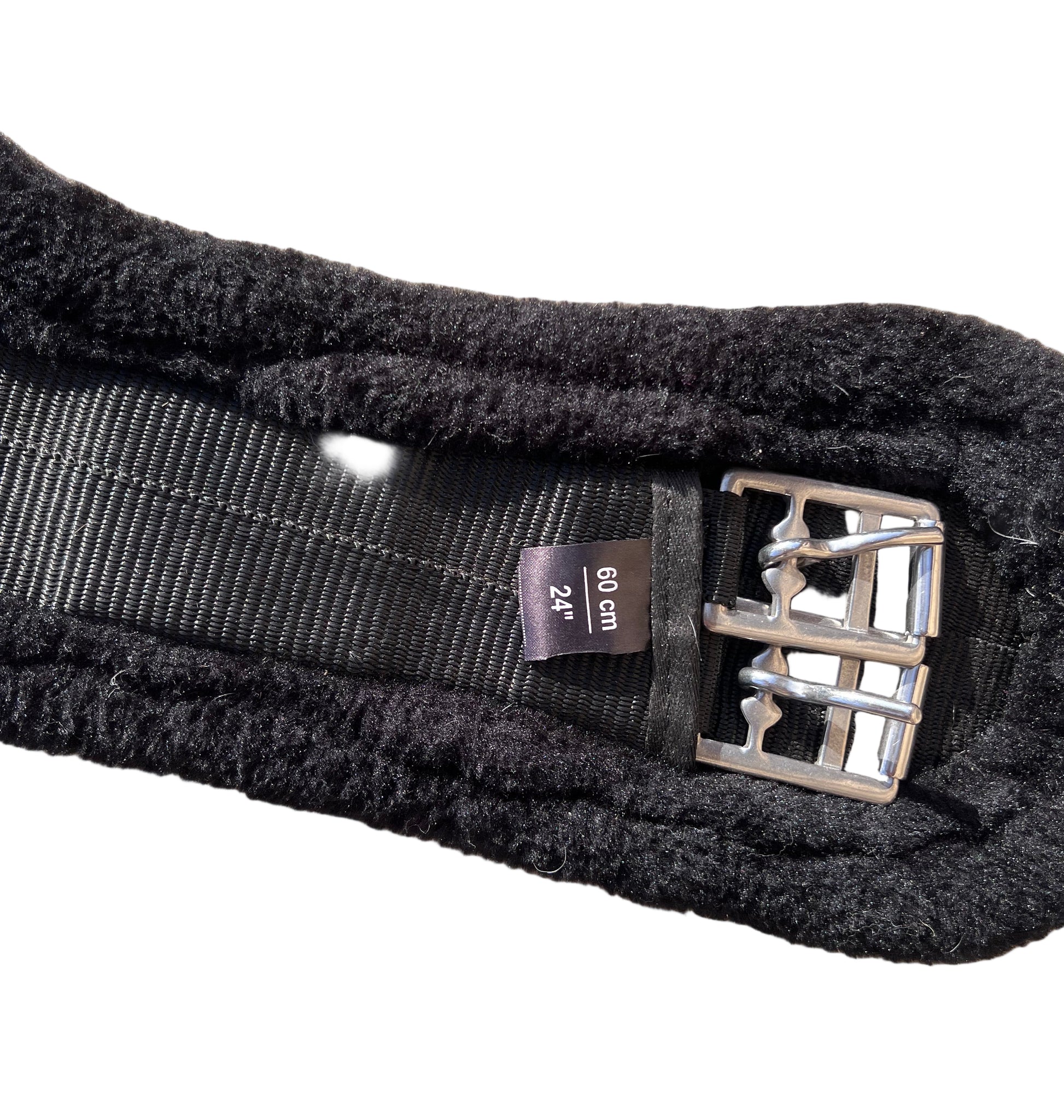 Sangle de dressage de forme anatomique. Empiècements élastiqués à chaque extrémité. Anneau en D central et boucles à rouleau. Doublure en polaire Teddy extra douce pour éviter les irritations dues aux frottements.