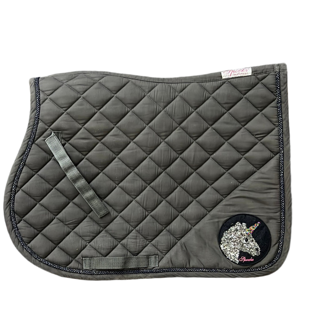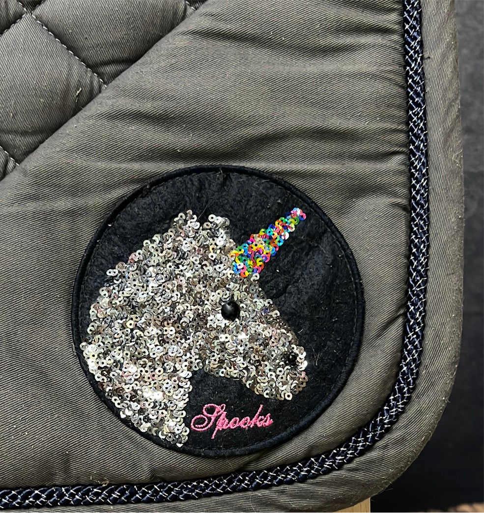 Robuster, perfekt gefütterter Teppich mit SPOOKS-Logo, dekorativem Pailletten-Einhorn und beidseitiger Zierkordel